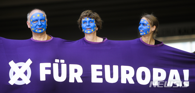 【베를린=AP/뉴시스】19일(현지시간) 독일 베를린에서 유럽연합(EU) 깃발로 얼굴에 페인팅을 한 시위자들이 행진하고 있다. 이날 독일을 비롯해 유럽 주요 도시에서 민족주의와 극우주의에 반대하는 대규모 시위가 열렸다.2019.05.19