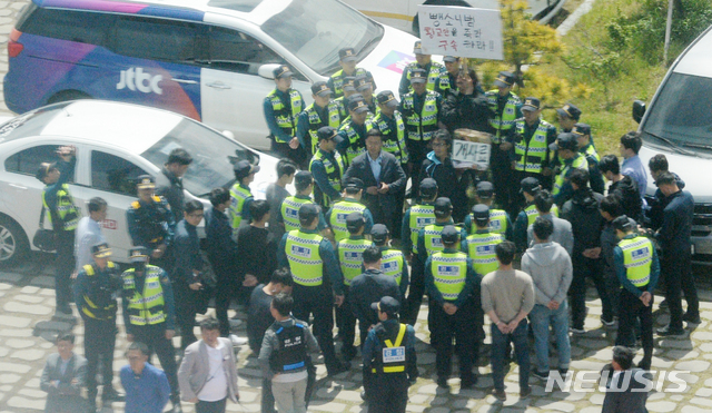 【김제=뉴시스】 김얼 기자= 자유한국당 전북현장 최고위원회가 20일 전북 김제시 새만금33센터에서 실시된 가운데 박성수 사회운동가가 개사료를 들고 황교안 대표를 기다리고 있다. 2019.05.20.