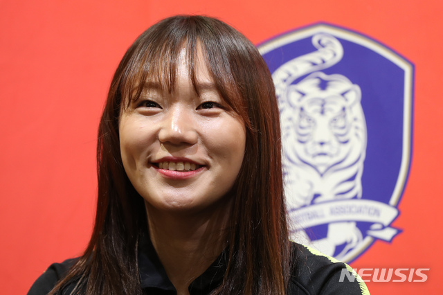 【서울=뉴시스】이윤청 기자 = 장슬기 선수가 20일 서울 강남구 스타필드 코엑스몰에서 열린 여자축구대표팀 미디어데이에서 인터뷰하고 있다. 2019.05.20. [email protected]