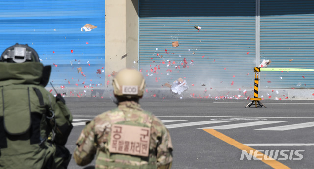 【성남=뉴시스】 김종택 기자 = 21일 오후 경기 성남시 중원구 성남종합운동장에서 열린 '2019 대테러 실전 합동훈련'에서 폭발물처리반(EOD)이 설치된 폭발물을 제거하고 있다. 2010.05.21