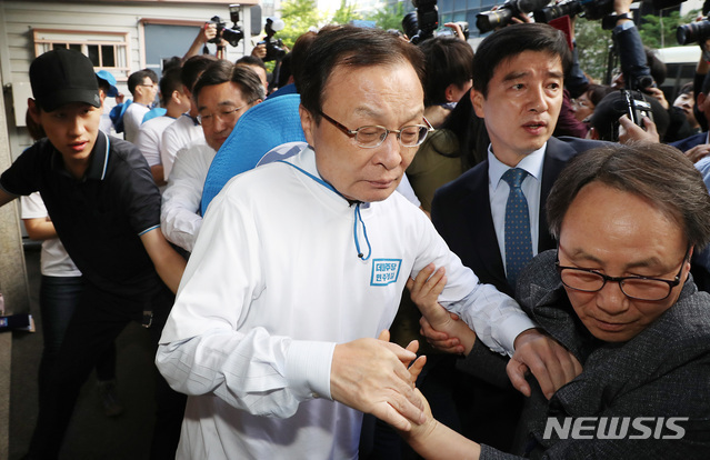 【서울=뉴시스】이종철 기자 = 21일 서울 여의도 더불어민주당 중앙당사 앞에서 열린 목포에서 봉하까지 ‘민주주의의 길’ 출정식에서 시각장애인들의 기습시위에 이해찬 대표가 몸을 피하고 있다. 2019.05.21.