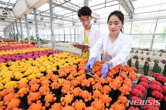 【서울=뉴시스】21일 부부의 날을 맞아 전북 완주 농촌진흥청 국립원예특작과학원 온실에서 직원들이 '비모란'과 '삼각주'를 붙여 만든 '접목 선인장'을 살펴보고 있다.