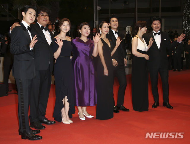 【칸=AP/뉴시스】배우 최우식, 봉준호 감독, 배우 박소담, 이정은, 조여정, 이선균, 장혜진, 송강호(왼쪽부터)가 21일(현지시간) 프랑스 칸의 팔레 드 페스티발에서 열리고 있는 제72회 칸 국제영화제 '기생충' 시사회에 도착해 포즈를 취하고 있다. 2019.05.22.