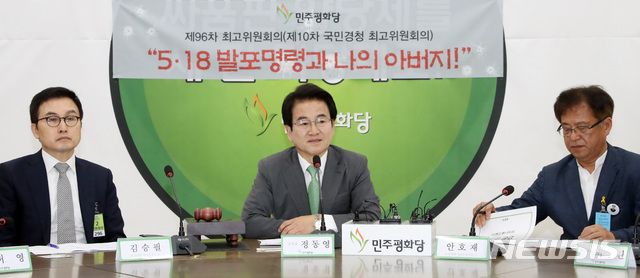【서울=뉴시스】 박영태 기자 = 22일 오전 서울 여의도 국회에서 열린 민주평화당 국민경청 최고위원회의에서 정동영 대표가 발언하고 있다. 왼쪽부터 5.18 당시 택시운전사였던 故 김사복 씨의 아들 김승필 님, 정동영 대표, 故 안병하 전남도경국장의 아들 안호재 님. 2019.05.22.