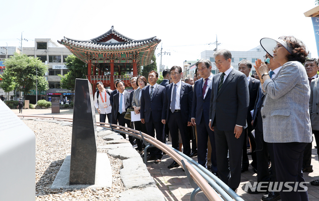 【청주=뉴시스】전신 기자 = 문재인 대통령이 22일 충북 청주중앙공원을 방문해 김영미 청주시 문화관광해설사로부터 압각수 설명을 들으며 역사유적지를 둘러보고 있다. 2019.05.22.