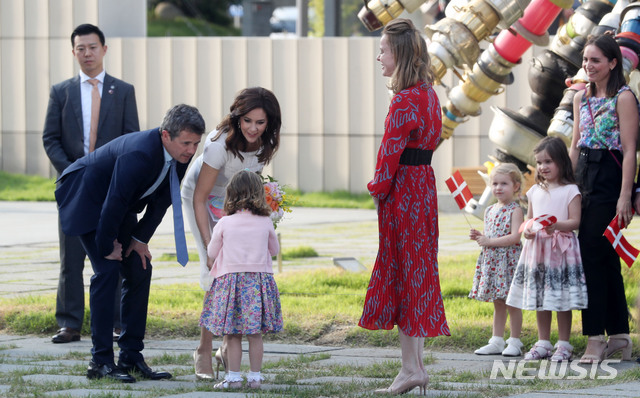 【서울=뉴시스】홍효식 기자 = 덴마크의 프레데릭 크리스티안 왕세자와 부인 메리 왕세자비가 22일 오후 서울 종로구 국립현대미술관 서울에서 열린 '아스게르 요른' 전시 개막식에 참석하며 교민으로 부터 환영받고 있다. 2019.05.22.