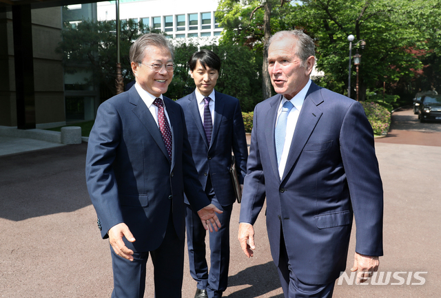조지 부시 전 미국 대통령 영접하는 문재인 대통