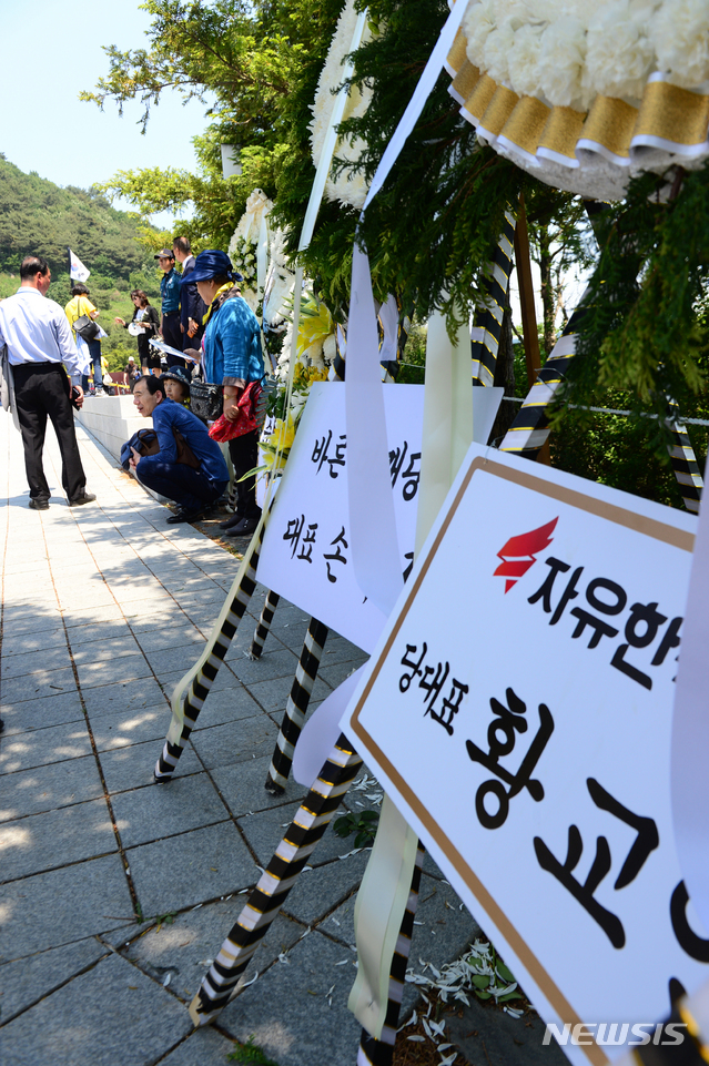 【김해=뉴시스】차용현 기자 = 고 노무현 전 대통령 10주기인 23일 오전 추도식이 열리는 대통령 묘역에는 자유한국당 황교안 대표가 보낸 근조화환이 서있다. 2019.05.23.