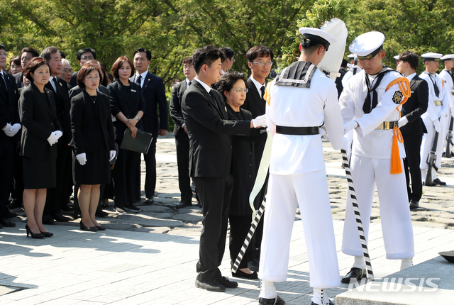 【김해=뉴시스】전신 기자 = 고 노무현 전 대통령 부인 권양숙 여사와 아들 노건호씨가 23일 오후 경남 김해 봉하마을에서 열린 노무현 전 대통령 서거 10주기 추도식에서 묘역에 헌화하고 있다. 2019.05.23.