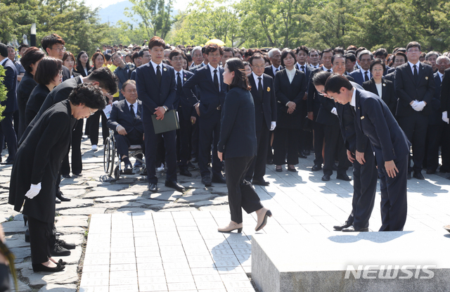 【김해=뉴시스】전신 기자 = 권양숙 여사가 23일 오후 경남 김해 봉하마을에서 열린 노무현 전 대통령 서거 10주기 추도식에서 묘역에 분향을 마친 자유한국당 조경태 최고위원과 인사하고 있다. 2019.05.23.