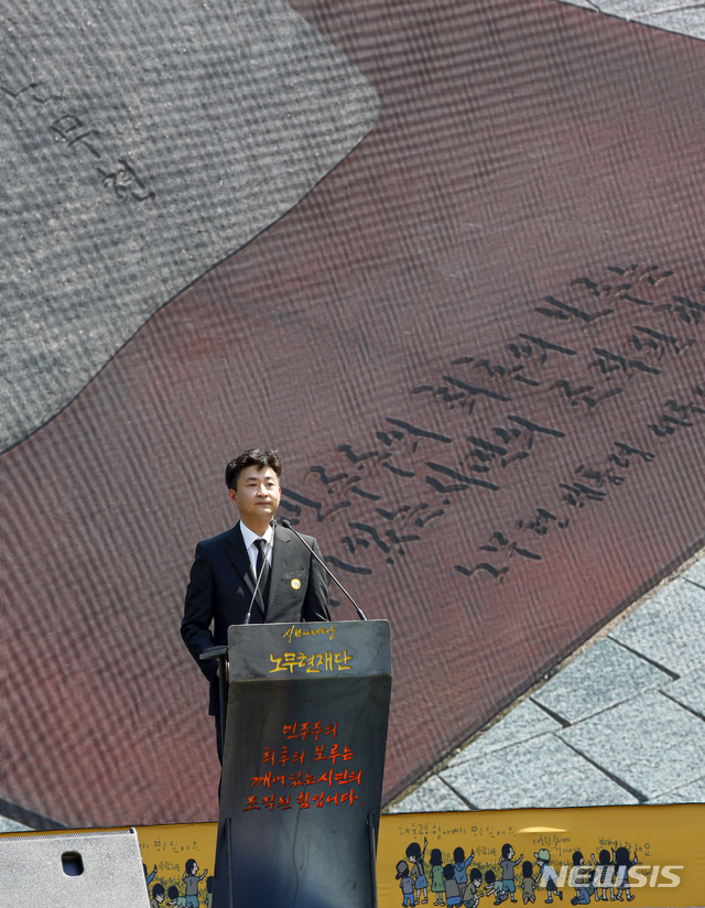 【김해=뉴시스】 차용현 기자 = 23일 오후 경상남도 김해시 진영읍 봉하마을에서 열린 고(故) 노무현 전 대통령 서거 10주년 추도식에서 노건호 씨가 인사말을 하고 있다. 2019.05.23. (사진=노무현재단 제공)