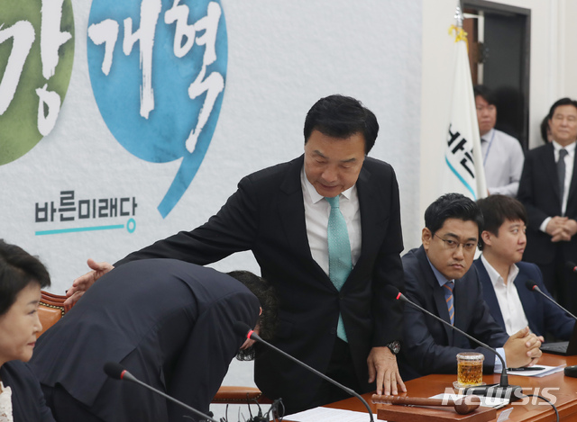 【서울=뉴시스】고승민 기자 = 24일 서울 여의도 국회에서 열린 바른미래당 임시최고위원회의에서 23일 손학규 대표를 향해 노인 폄하성 발언으로 물의를 빚은 하태경 최고위원이 사과 발언을 한 뒤 손 대표에게 허리숙여 사과하고 있다. 2019.05.24.