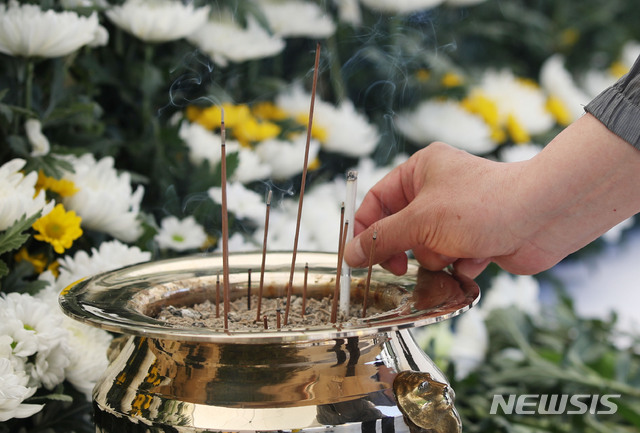 【서울=뉴시스】박미소 기자 = 24일 오전 서울 중구 덕수궁 대한문 앞에 마련된 고 노무현대통령의 시민분향소에서 한 시민이 향로에 담배를 놓고 있다. 2019.05.24.