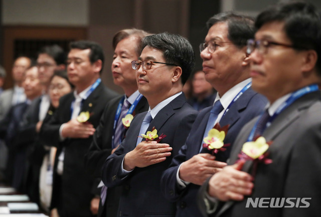 【서울=뉴시스】박미소 기자 = 김동연(오른쪽 세번째) 전 경제부총리 겸 기획재정부 장관이 24일 오후 서울 중구 프레스센터에서 열린 '한국장학재단 창립 10주년 심포지엄, 대학 혁신과 학자금 지원'에서 국민의례를 하고 있다. 2019.05.24.