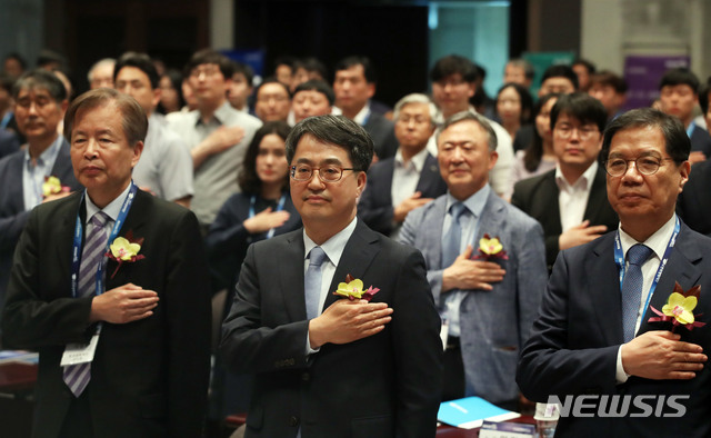 【서울=뉴시스】박미소 기자 = 김동연(가운데) 전 경제부총리 겸 기획재정부 장관을 비롯한 참석자들이 24일 오후 서울 중구 프레스센터에서 열린 '한국장학재단 창립 10주년 심포지엄, 대학 혁신과 학자금 지원'에서 국민의례를 하고있다.2019.05.24.