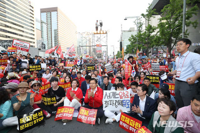 【서울=뉴시스】김병문 기자 = 자유한국당 황교안 대표와 나경원 원내대표를 비롯한 지지자들이 25일 오후 서울 종로구 세종문화회관 앞에서 열린 '문재인 STOP, 국민이 심판합니다!' 규탄대회에 참석해 박수를 치고 있다. 2019.05.25.