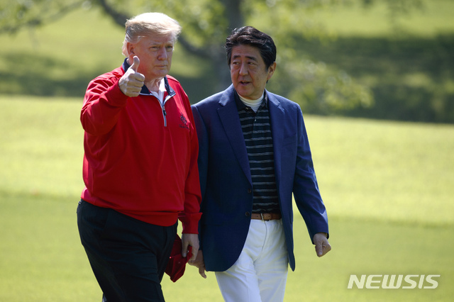 【모바라(일본)=AP/뉴시스】도널드 트럼프(왼쪽) 미국 대통령이 26일 오전 지바현 모바라 시의 모바라 컨트리클럽에서 아베 신조 일본 총리와 함께 걸으며 엄지를 치켜 세우고 있다. 2019.05.26.