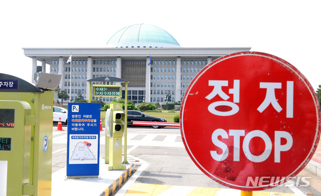 【서울=뉴시스】이종철 기자 = 선거제·검찰개혁법 패스트트랙(신속처리안건) 지정으로 촉발된 여야의 극한대치 국면이 좀처럼 출구를 찾지 못하면서 추경 처리를 위한 5월 임시국회 소집은 사실상 물건너 간 상황인 가운데 26일 서울 여의도 국회에 차량 통제용 정지 팻말이 서 있다. 2019.05.26.