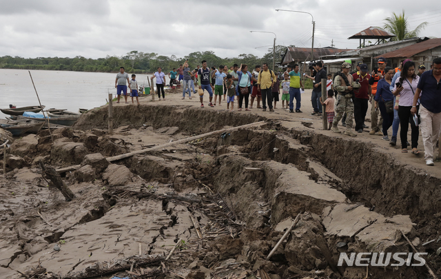 【유리마과스=AP/뉴시스】페루 중북부에서 26일(현지시간) 발생한 규모 8.0의 강진으로 유리과마스 외각의 한 강둑이 무너져 있다.