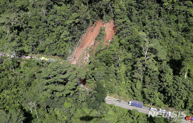 【유리마과스=AP/뉴시스】페루 중북부에서 26일(현지시간) 발생한 규모 8.0의 강진으로 유리과마스에서 산사태가 일어나 도로가 막혀 있다.