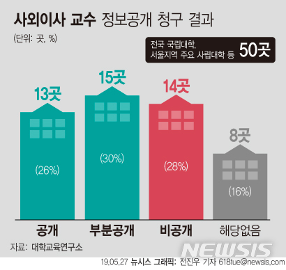 【서울=뉴시스】대학교육연구소는 27일 전국 국립대학과 서울지역 주요 사립대학 등 50개 대학에 사외이사로 근무 중인 교수의 정보공개 청구를 했지만 정상적으로 정보를 공개한 대학은 13개 대학에 불과했다고 밝혔다. (그래픽=전진우 기자)