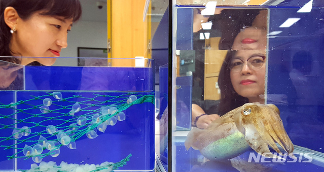 【세종=뉴시스】강종민 기자 = 해양수산부가 인공으로 부화한 갑오징어를 어미로 성장시켜 다시 알을 받아 부화시키는 전 주기적 양식기술을 국내에서 처음으로 개발하는데 성공했다고 밝혔다. 27일 오전 정부세종청사에서 해수부 직원들이 갑오징어알과 갑오징어를 살펴보고 있다. 2019.05.27.