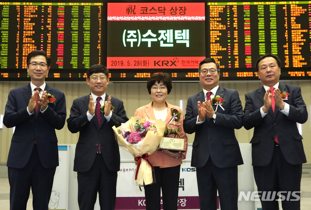 【서울=뉴시스】한국거래소 코스닥시장본부는 28일 오전 서울 여의도 한국거래소 서울사옥 홍보관에서 체외진단 의료기기 제조업체인 수젠텍의 코스닥시장 신규상장기념식을 개최했다.
