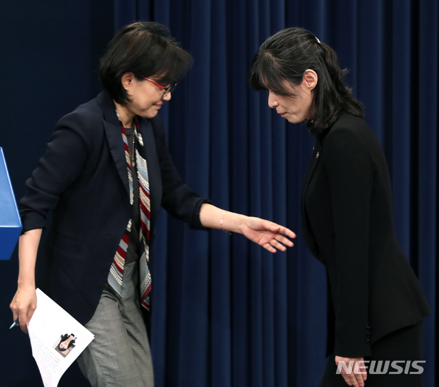 【서울=뉴시스】박진희 기자 = 조현옥 전 인사수석이 28일 청와대 춘추관에서 차관급 인사 브리핑을 마치자 김외숙 신임 인사수석이 인사말 하기 위해 단상에 오르고 있다. 2019.05.28.