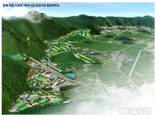 【김해=뉴시스】김상우 기자= 경남 김해시는 진례면 송정리 일원 367만㎡에 주거단지 스포츠·레저시설을 조성하는 (주)록인 김해레스포타운 사업이 14년만에 공사를 시작한다고 29일 밝혔다. 2019.05.29 (조감도=록인 제공)