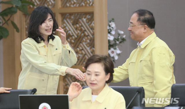 【세종=뉴시스】강종민 기자 = 29일 오전 정부세종청사 청와대-세종 을지태극 국무회의장에서 홍남기 부총리 겸 기획재정부 장관이 청와대 인사수석으로 임명된 김외숙 법제처장에게 축하인사를 건네고 있다. 2019.05.29.