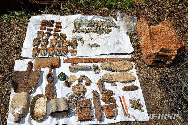 【철원=뉴시스】사진공동취재단 = 28일 강원 철원군 민통선 내 우리 측 지역인 화살머리고지일대에서 군관계자가 취재진에게 발굴된 유품에 관해 설명하고 있다.