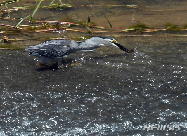 【남해=뉴시스】차용현 기자 = 30일 오전 경남 남해군 남해읍 한 하천에서 검은댕기해오라기 한 마리가 물고기 사냥을 하고 있다. 2019.05.30.