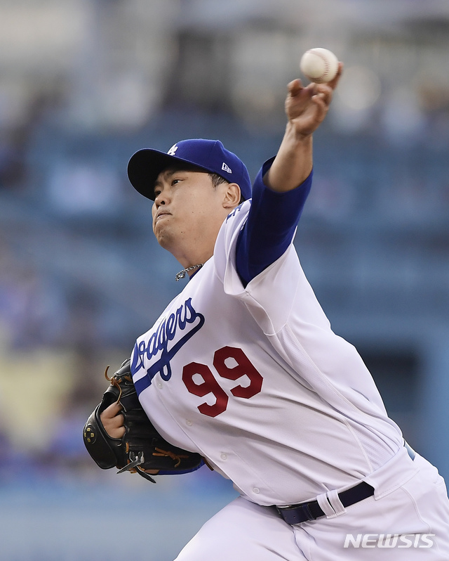 【로스앤젤레스=AP/뉴시스】LA 다저스의 류현진이 30일(현지시간) 미 캘리포니아주 로스앤젤레스 다저스타디움에서 열린 2019 메이저리그 뉴욕 메츠와의 경기에 등판해 역투하고 있다.