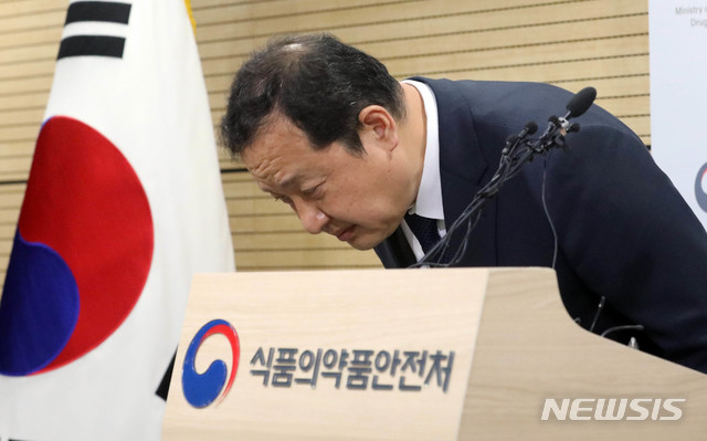 【청주=뉴시스】강종민 기자 = 강석연 식품의약품안전처 바이오생약국장이 28일 오전 충북 청주 식약처에서 성분이 뒤바뀐 골관절염 유전자치료제 '인보사케이주'에 대한 최종 조사 결과를 발표에 앞서 인사하고 있다.