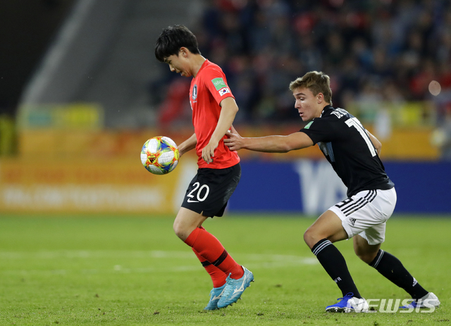 【티히(폴란드)=AP/뉴시스】김세윤(왼쪽)이 5월31일(현지시간) 폴란드 티히의 티히 경기장에서 열린 2019 국제축구연맹(FIFA) U-20 월드컵 아르헨티나와의 조별 리그 F조 3차전에서 공을 다투고 있다.