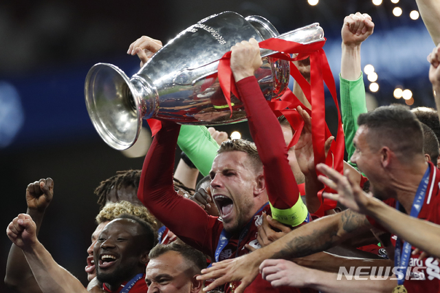 【마드리드=AP/뉴시스】1일(현지시간) 스페인 마드리드의 에스타디오 메트로폴리타노에서 열린 2018-19 UEFA 챔피언스리그 결승전에서 토트넘에 승리해 우승한 리버풀 선수들이 우승컵을 들고 환호하고 있다.