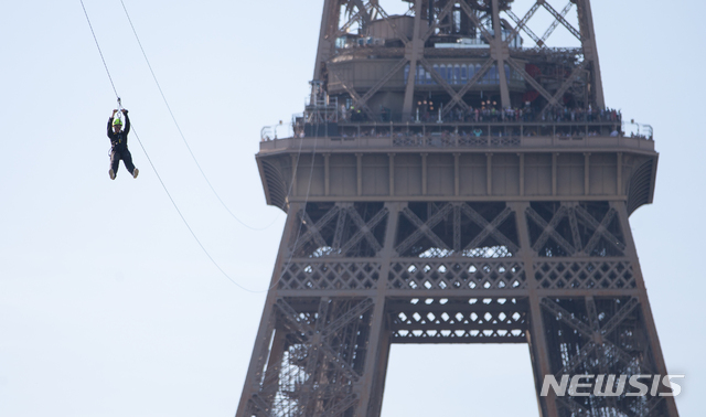【파리(프랑스)=뉴시스】 이준성 프리랜서 기자 = 1일 오후(현지시각) 프랑스 파리 에펠탑에서 관광객이 짚와이어를 타고 활강하고 있다. 2019.06.02. [email protected]