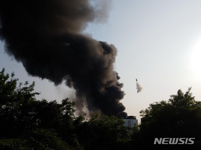 【안성=뉴시스】엄태수 기자 = 2일 오후 16시 36분경 미양면 동성화인텍 3공장(우레탄 단열재 제조 공장)에서 화재 발생, 헬기가 진화작업을 하고 있다. 2019.06.02.