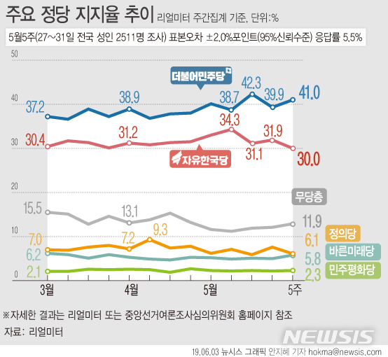 【서울=뉴시스】리얼미터가 YTN의 의뢰로 실시한 5월 5주차(27~31일) 주R간 집계에서 더불어민주당 지지율은 전주 대비 1.7%p 상승한 41.0%, 자유한국당 지지율은 1.9%p 하락한 30.0%로 집계됐다. (그래픽=안지혜 기자)