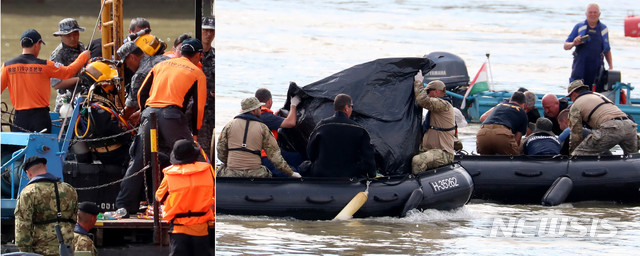 【부다페스트(헝가리)=뉴시스】추상철 기자 =유람선 사고 엿새째인 3일 오후(현지시각) 헝가리 부다페스트 다뉴브강 사고현장에서 대한민국 정부 합동 신속대응팀 잠수사 투입(왼쪽)으로 수습된 시신을 헝가리 구조대가 옮기고 있다. 2019.06.04.