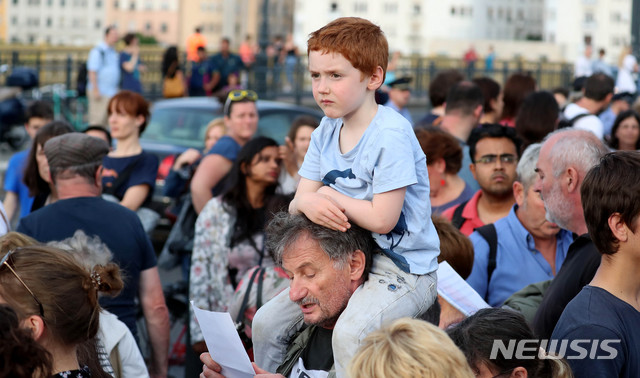 【부다페스트(헝가리)=뉴시스】추상철 기자 =유람선 사고 엿새째인 3일 오후(현지시각) 헝가리 부다페스트 다뉴브강 사고현장위 머르기트 다리위에서 헝가리 국민들이 사고 희생자를 추모하며 아리랑을 부르고 있다. 2019.06.04.