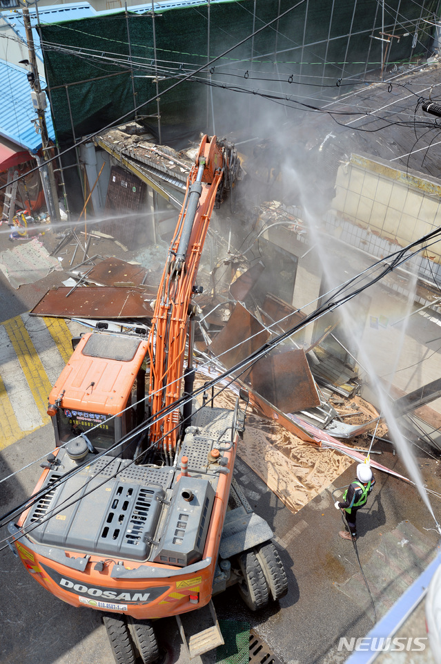 【대구=뉴시스】우종록 기자 = 대구 성매매 집결지인 속칭 ‘자갈마당’ 철거작업이 시작된 4일 오전 대구 중구 도원동 자갈마당에서 작업자들이 중장비를 동원해 건물을 철거하고 있다.
