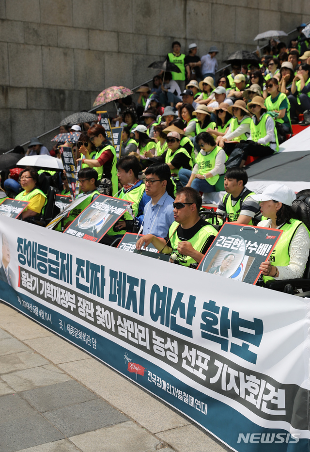 【서울=뉴시스】 이윤청 기자 = 전국장애인차별철폐연대가 4일 서울 종로구 세종문화회관 계단 앞에서 기자회견을 열고 장애등급제의 실질적 폐지를 촉구하고 있다. 2019.06.04.