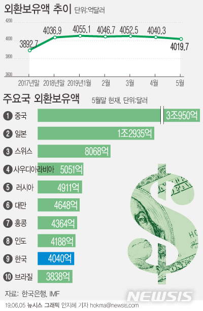 【서울=뉴시스】4일 한국은행에 따르면 지난달 말 기준 우리나라의 외환보유액은 20억6000만달러 감소한 4019억7000만달러다. (그래픽=안지혜 기자)