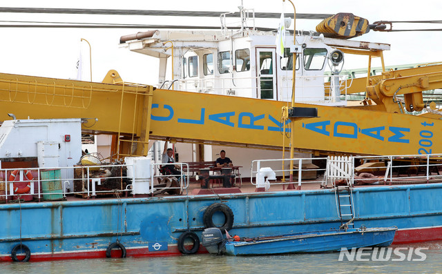 【부다페스트(헝가리)=뉴시스】추상철 기자 = 유람선 인양작업에 동원될 인양선이 5일 오후(현지시각) 헝가리 부다페스트 다뉴브강 사고현장으로 부터 상류에 정박해 있다. 2019.06.05.