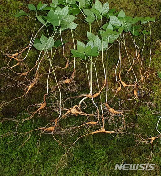 【담양=뉴시스】변재훈 기자 = 한국전통심마니협회는 고모(50)씨가 조상 묘를 벌초하러 나섰다가 지난 2일 전남 담양군 무등산 자락에서 수령이 70년 안팎으로 추정되는 천종(天種) 산삼 21뿌리(감정가 1억원 대)를 발견했다고 6일 밝혔다. 2019.06.06. (사진=한국전통심마니협회 제공)