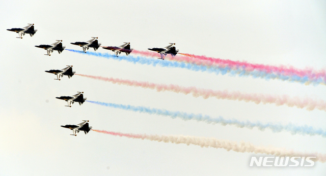 【광주=뉴시스】류형근 기자 = 현충일인 6일 오전 광주 광산구 광주공항 인근 상공에서 공군 특수비행팀 블랙이글스가 훈련비행을 하고 있다. 블랙이글스는 8일 열리는 제41회 공군참모총장배 스페이스 챌린지(Space Challenge 2019) 광주·전남 예선대회 축하비행에 출격한다. 2019.06.06.