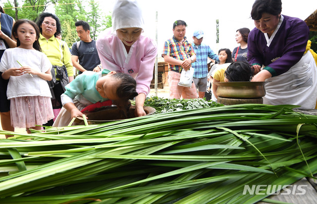 【용인=뉴시스】 김종택 기자 = 단오 (음력5월5일)를 앞두고 6일 경기 용인 한국민속촌에서 한복을 차려입은 관광객 들이 창포물에 머리감기 체험을 하고 있다.