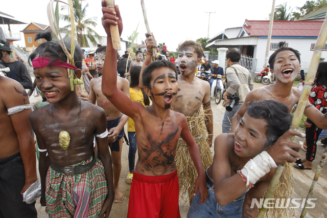 【프놈펜(캄보디아)=AP/뉴시스】7일(현지시간) 캄보디아 수도 프놈펜 북서쪽 프링카에크 마을에서 몸에 분장을 한 어린이들이 주식인 쌀의 풍작을 기원하는 연례 기우 행사에 참여하고 있다. 2019.06.07.