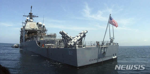 【코친=AP/뉴시스】미국과 러시아 군함이 7일 동중국해에서 상호 50m 내 근접운항을 했다는 보도가 나왔다. 사진은 미 유도탄순양함 챈슬러스빌호가 지난 2002년 9월27일 인도 남부 코친항에 정박 중인 모습. 2019.06.07.